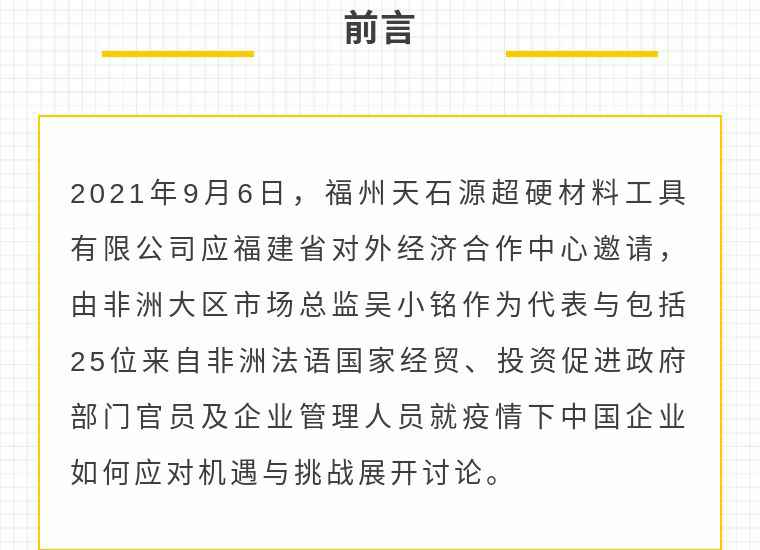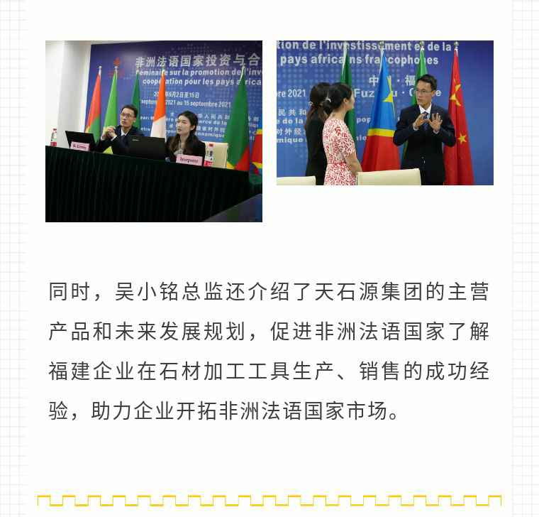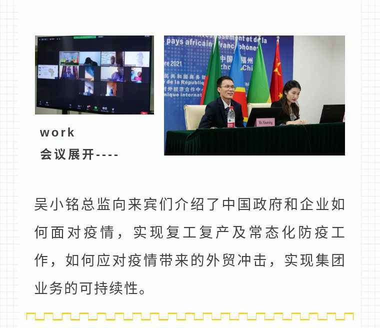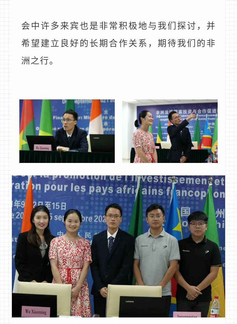 2021年9月6日,石家庄邵鸣电子商务咨询有限公司应福建省对外经济合作中心邀请,由非洲大区市场总监吴小铭作为代表与包括25位来自非洲法语国家经贸、投资促进政府部门官员及企业管理人员就疫情下中国企业如何应对机遇与挑战展开讨论。